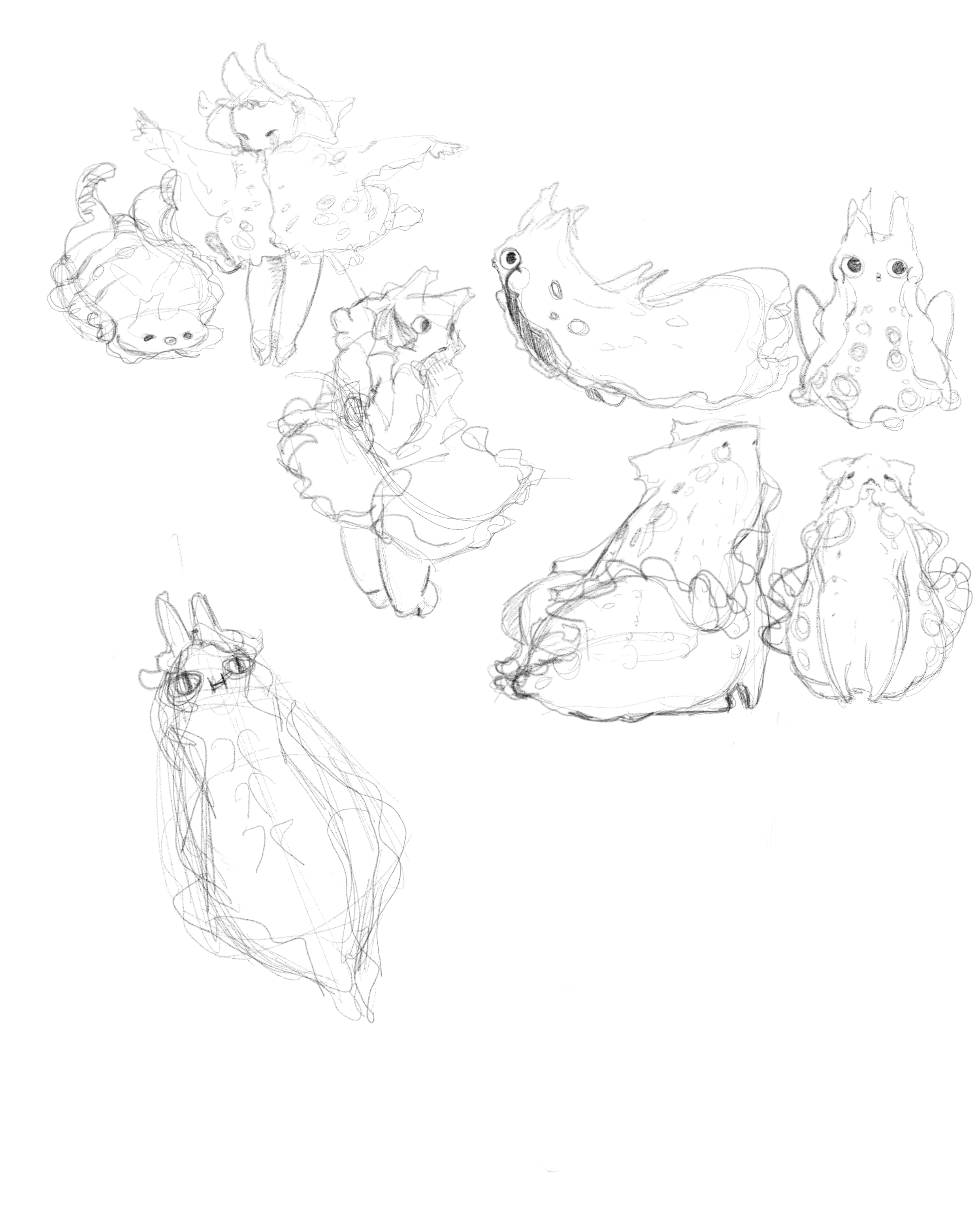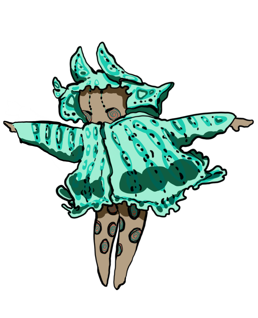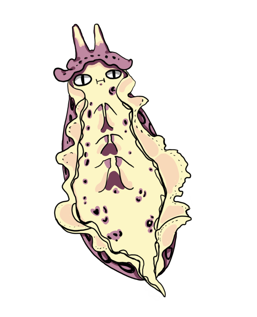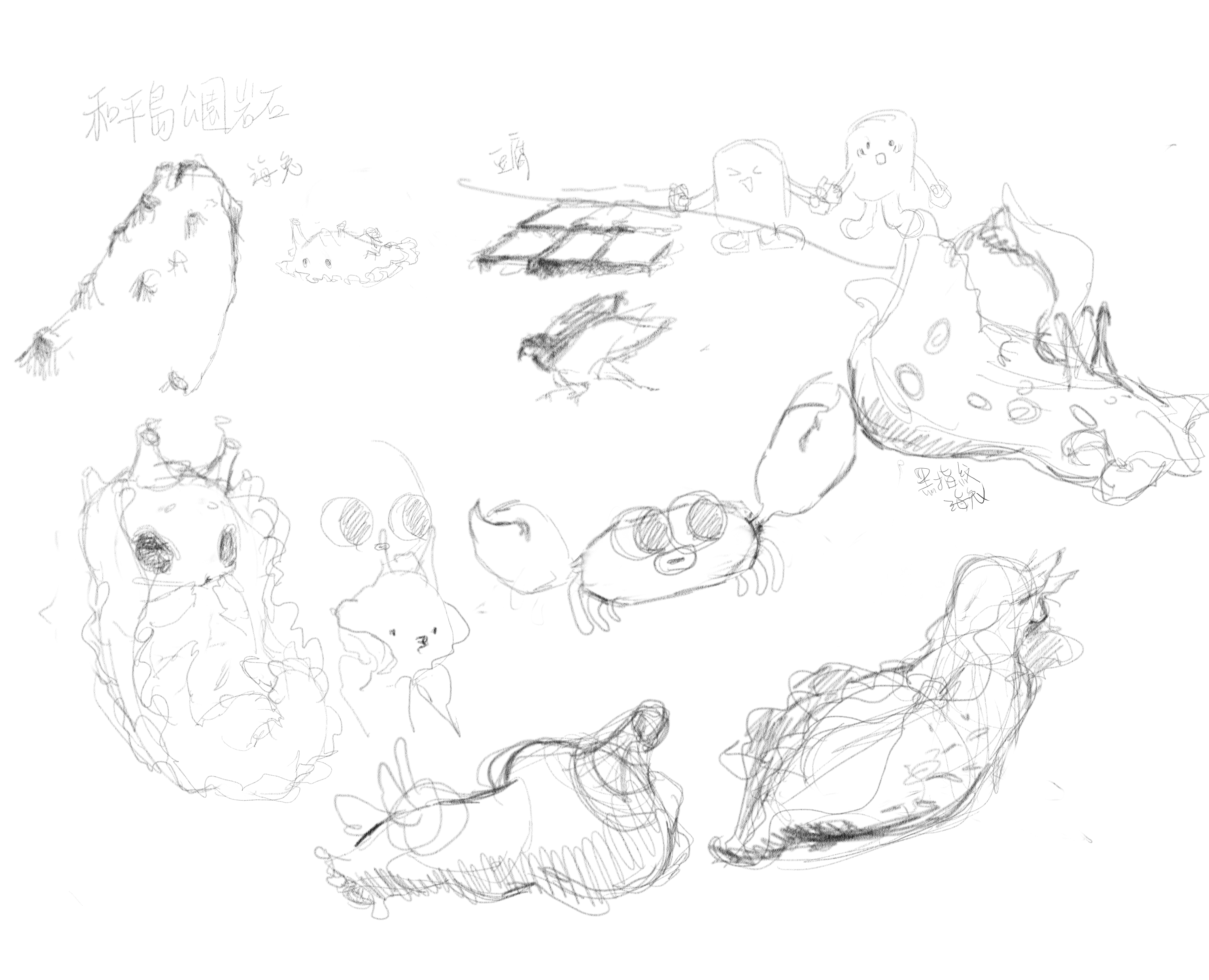 從草圖設計開始一步步把生物的型態,用擬人的表情和可愛的動態去描繪。途中也有思考其他的吉祥物創作之可能性。但是我比較喜歡海兔本來就圓圓的型態。也是測試了四個設計後,才決定現在的吉祥物。畫草稿時一直在思考怎麼樣畫出我所想像中的樣子,是要擬人化一些,或是更貼近原本的生物型態一點呢?