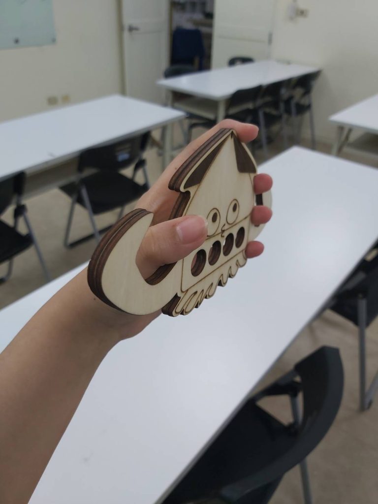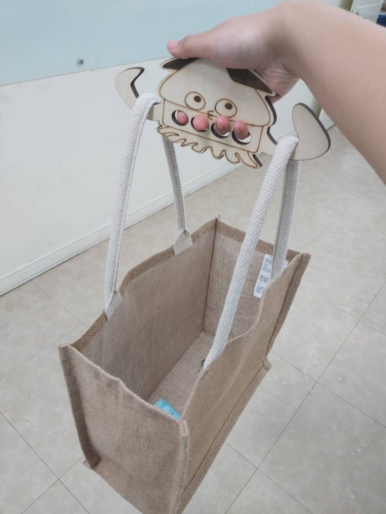 材料主要為平板板材木質板,透過雷雕機進行切割與挖洞,再將頭頂小洞放入要鑰匙圈,可增加日常攜帶方便性,不用於購物時也可以當作可愛吊飾,就是這樣。