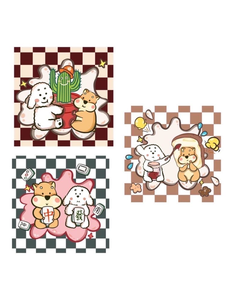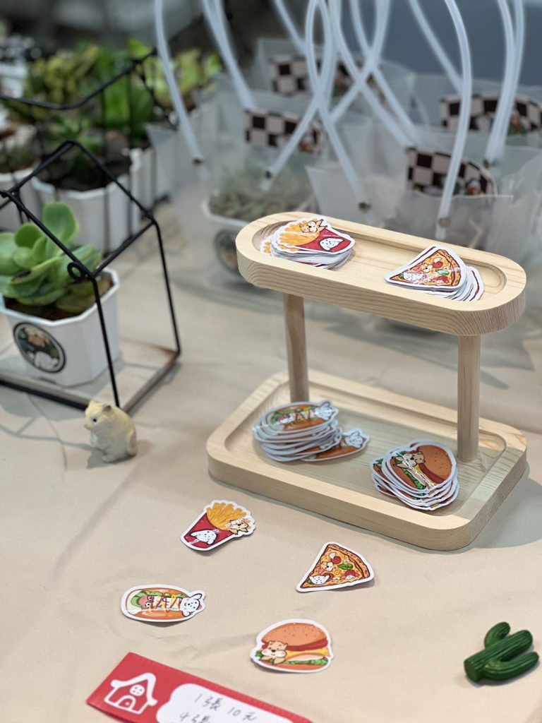 我們運用倉鼠、小狗當作主角做出一系列的產品,包括卡貼、貼紙、卡片、別針等等,在貼紙設計上是用一個套餐的概念,有熱狗、鼠條、披薩、以及鼠來堡等等.