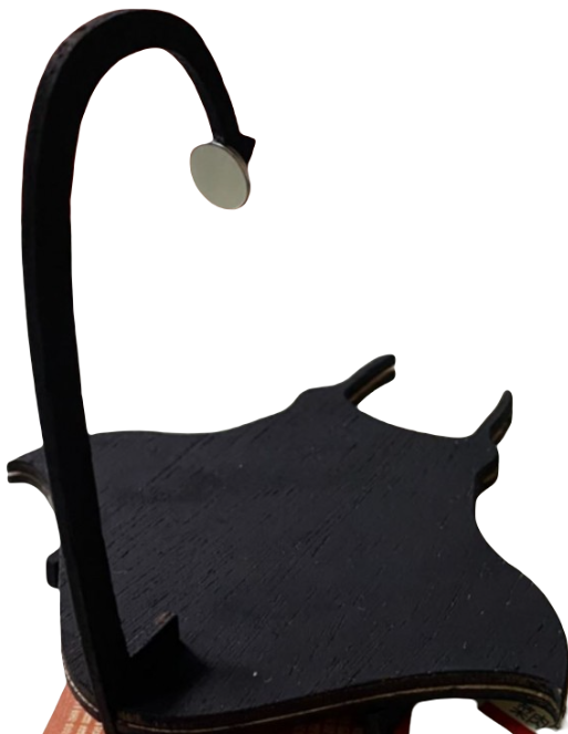 作品通體為黑色,因為大部分人的桌子都是淺色系的,放一個深色的東西在桌上比較好辨識,也可以凸顯出放在上面的小物件,這樣更方便辨識、找到自己想要的東西。作品的大小大概是一個小的馬克杯,這樣部會佔到太多桌面上的空間,也可以放置夠多的東西在上面,是一個大小適中的實用型的擺飾品。