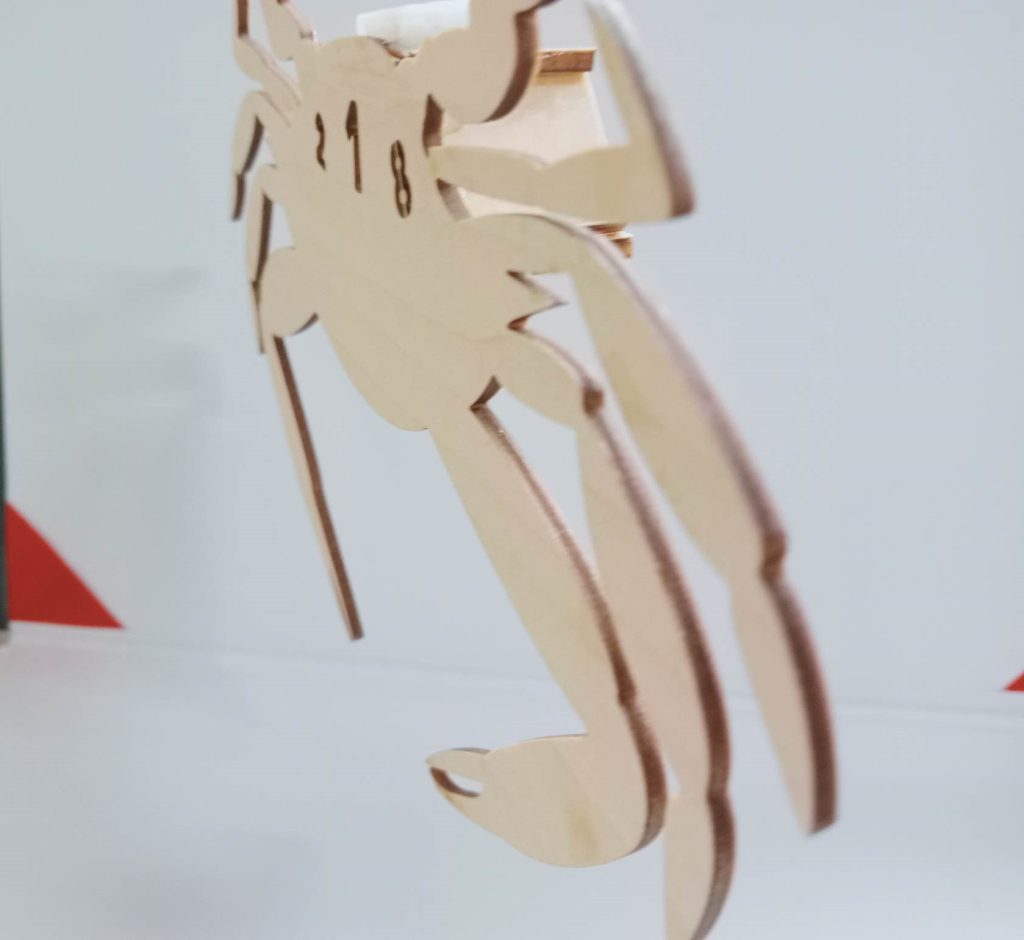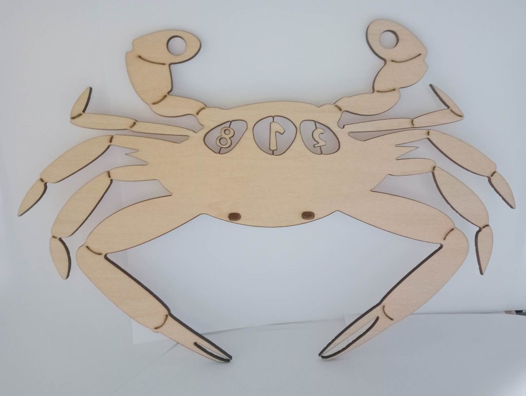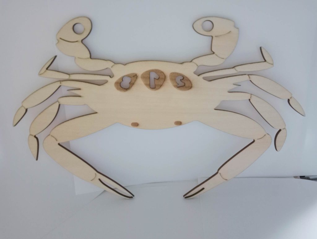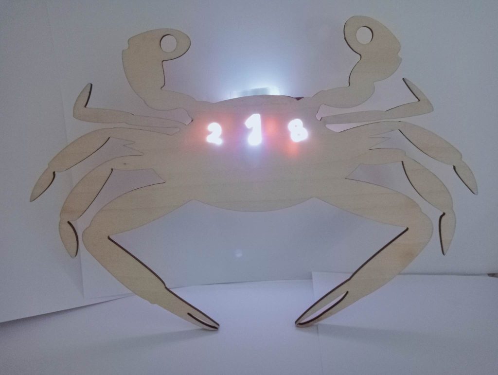 因為我們的主題是基隆當地海產加上材質限定在木材,所以我希望可以結合稍微堅硬一點的海產,一開始就把心思放在蝦子、貝殼、螃蟹上,查了一下發現基隆的三點蟹蠻有名的,而且我們宿舍的號碼剛好都是三個,所以就從三點蟹下手。我把三點蟹身上的三個點挖空,中間保留數字,再加上一點花紋,即使這樣我還是覺得太過單調,而且三個點不是很明顯,所以我去蝦皮買了小串燈放在三個點的後面讓三個點可以發光。