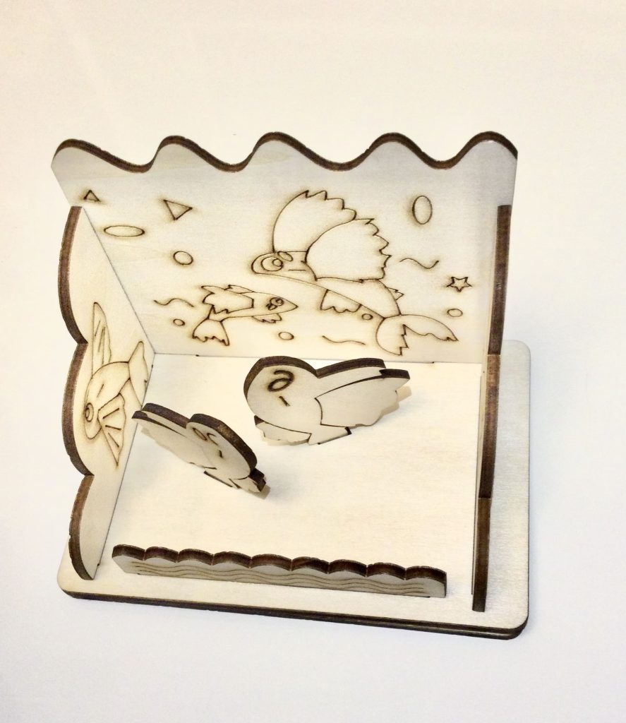 名稱分別為螃蟹與碼頭名片架(設計概念:棲息在海邊附近的螃蟹與設立在海港的碼頭息息相關,適合聯想在一起)、飛魚名片架(設計概念:我認為,飛魚算是在海洋中很特殊的生物,也具有一定的代表性)、烏章魷名片架(設計概念:因為大多數人都會把這些軟體動物搞混,因此希望藉由此設計來突顯出這三隻軟體動物的特色來讓更多人分清這些動物)