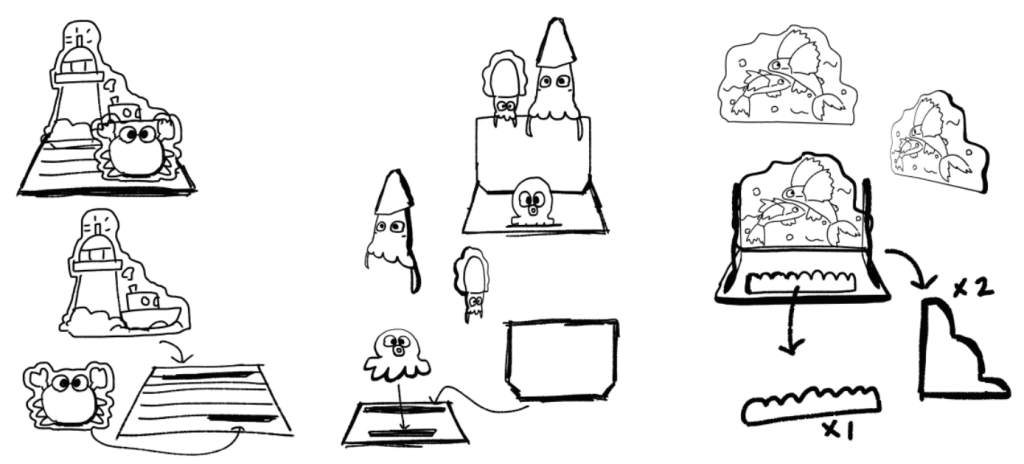 以名片架作為產品之後,草稿畫了三種帶有不同海產的名片架,分別為螃蟹、烏賊、飛魚,之後才選了飛魚作為最終形象。 名稱分別為螃蟹與碼頭名片架(設計概念:棲息在海邊附近的螃蟹與設立在海港的碼頭息息相關,適合聯想在一起)、飛魚名片架(設計概念:我認為,飛魚算是在海洋中很特殊的生物,也具有一定的代表性)、烏章魷名片架(設計概念:因為大多數人都會把這些軟體動物搞混,因此希望藉由此設計來突顯出這三隻軟體動物的特色來讓更多人分清這些動物)
