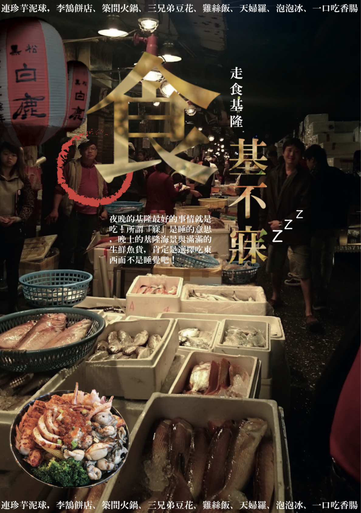 這個海報就是以基隆不夜城的崁仔頂漁市作為主題,將其在深夜兩點卻熱鬧非凡的獨特場面表現出來,以四張崁仔頂漁市的照片作排版,盡力據實呈現叫賣現場高昂的氣氛,以及新鮮漁獲豐收的場景,讓人看到這張海報能回想起漁市歡快熱情的濃濃人情味以及不絕於耳的叫賣聲。除此之外也在上下各放了一排私心推薦的基隆美食,所以說,半夜的基隆就是海鮮天堂,當然不能寐!如果有機會,在夜晚走入崁仔頂,才真正感受到這個帶動基隆繁榮、北台灣最大魚市「崁仔頂」的魅力。
